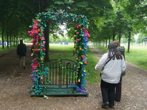 Pour cause de grève des transports, nous n'étions que neuf au départ de la promenade du 19 mai au Parc de Saint-Cloud. Traversant le Pont de Sèvres, nous avons sur notre gauche une vue sur la pointe de l'ile Seguin, parcourue par les amicalistes en avril 2015. Le grand auditorium, qui n'était à l'époque qu'un début de chantier, est en train de prendre forme (1). A droite, rien n'a changé: C'est la Seine majestueuse, avec ses péniches, sur fond de musée de la manufacture de Sèvres (2). Nous entrons dans la Domaine de Saint-Cloud par la grille de Sèvres, confrontés d'emblée à une tapisserie en plein air qui représente les yeux du cinéaste Jacques Demy (3). Un peu plus loin, c'est un portail multicolore constitué de bouchons en plastique (4), puis un assemblage de balais, en forme de bananier ornemental (5). Il paraît que c'est de l'art.