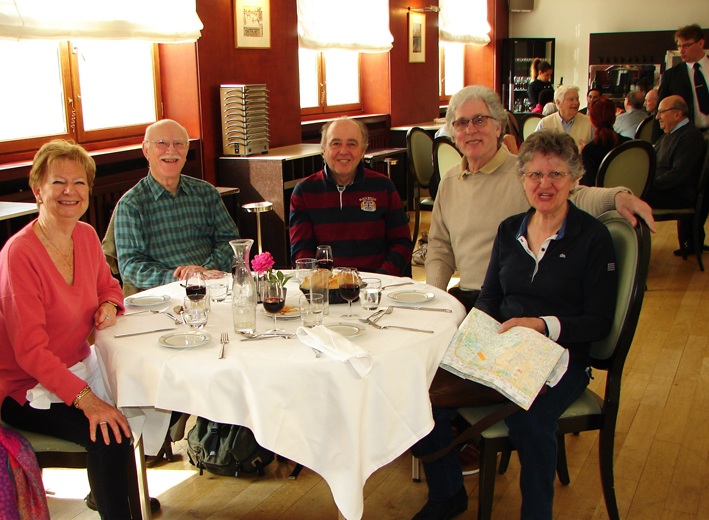 Le repas pour les 29 participants est un grand moment de convivialité (11 à 15). Au menu: tarte à l'oignon, magret de canard et gratin dauphinois, salade de fruits de saison.