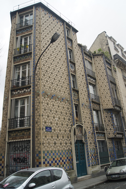 Après le repas, nous poursuivons notre chemin le long de l'ancienne voie ferrée. L'immeuble Deneux, en béton masqué par des céramiques (16), retient notre attention. Il date de 1911-1913. Son architecte, Henri Deneux (1874-1969), s'est représenté en mosaïque dans le tympan de la porte d'entrée.